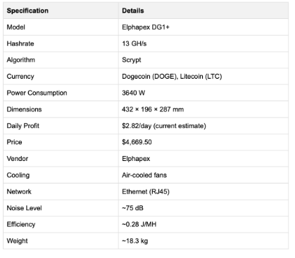 The ElphaPex DG1+ delivers 13 GH/s Scrypt power at 3640W with solid 0.28 J/MH efficiency, ideal for Dogecoin and Litecoin miners targeting consistent DOGE/LTC rewards in 2025. Paired with OneMiners' unboxing video, transparent hosting from $0.048/kWh, AI pool optimization (+6-115% revenue boost), and Buy Now Pay Later financing, it transforms high-spec hardware into a low-risk, profitable operation.